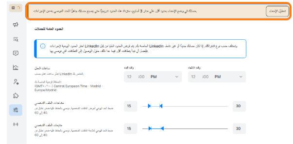 كل حساب جديد في Sales Engagement Tool يبدأ في وضع الإحماء. يعمل هذا الوضع الخاص مع الحدود العالمية للحملات، والتي ستجدها تحت علامة التبويب الإعدادات. إنه مثل مقدمة لطيفة للأداة، مما يضمن أن كل شيء يعمل بسلاسة من البداية.