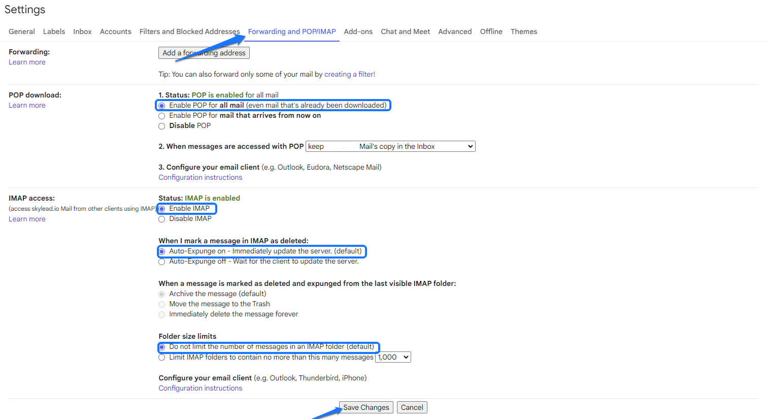 بعد ذلك، انقر على علامة التبويب التوجيه وPOP/IMAP. قم بتمكين هذه الخيارات: