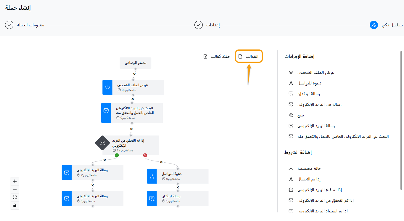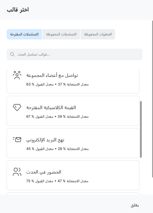 اكتشف قوة قوالب الحملات في Sales Engagement Tool! 🎉 ببساطة انقر على "القوالب" في الزاوية العلوية اليمنى من منشئ الحملات للوصول إلى سبعة خيارات مصممة مسبقًا لمجموعة متنوعة من أهداف التواصل. قم بتخصيصها لتناسب احتياجاتك الفريدة وارتق بحملاتك بسهولة. ابدأ بالتواصل بسهولة وكفاءة! 🚀