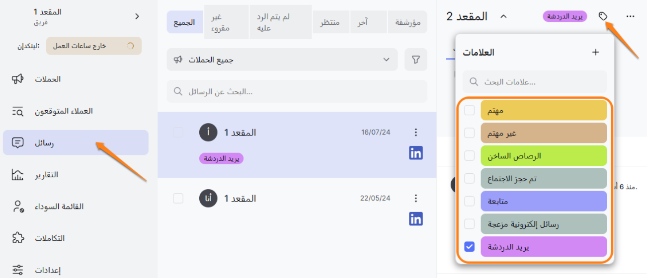 اضغط على خيار 'التسميات' وستظهر قائمة منسدلة تحتوي على فلاتر متنوعة. اختر من بين التسميات المحددة مسبقًا مثل 'مهتم'، 'غير مهتم'، 'عميل محتمل ساخن'، 'اجتماع محجوز'، 'متابعة'، 'SPAM'، و'يرغب في الدردشة'.