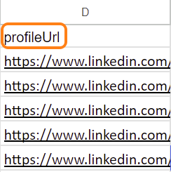 - لحملة البريد الإلكتروني + LinkedIn المدمجة، ستحتاج إلى عمودين: واحد لعناوين البريد الإلكتروني وآخر لعناوين URL لملفات التعريف الخاصة بعملائك. تأكد من أن العمود الذي يحتوي على عناوين URL لملفات التعريف يسمى بالضبط profileUrl (بحرف 'U' كبير).