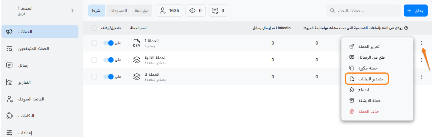 - يمكنك تصدير البيانات من حملة محددة. هذا مثالي عندما تريد جمع رؤى من حملة معينة! فقط انقر على زر النقاط الثلاث بجانب الحملة المفضلة ثم اختر الخيار "تصدير البيانات" لتصدير الملف.