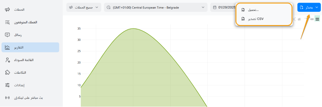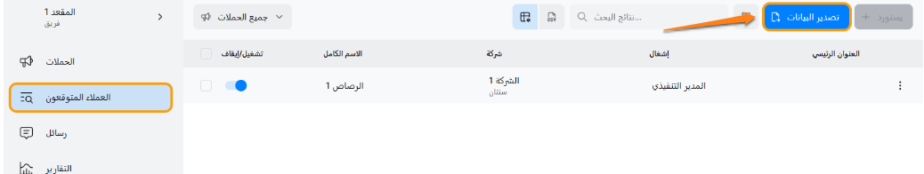 - يمكن الوصول إلى هذا الخيار من قسم العملاء المحتملين في قائمة الجانب الأيسر. يتيح لك تصدير البيانات من جميع حملاتك دفعة واحدة.