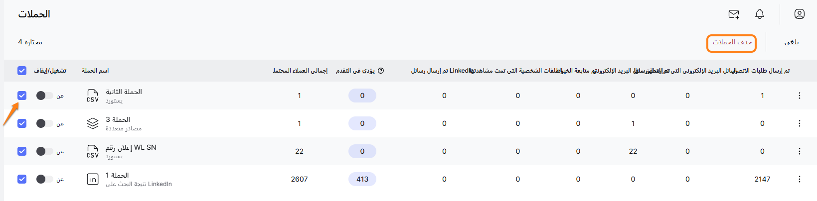 - لحذف عدة حملات دفعة واحدة، حدد الحملات التي ترغب في حذفها وانقر على زر 'حذف الحملات'.