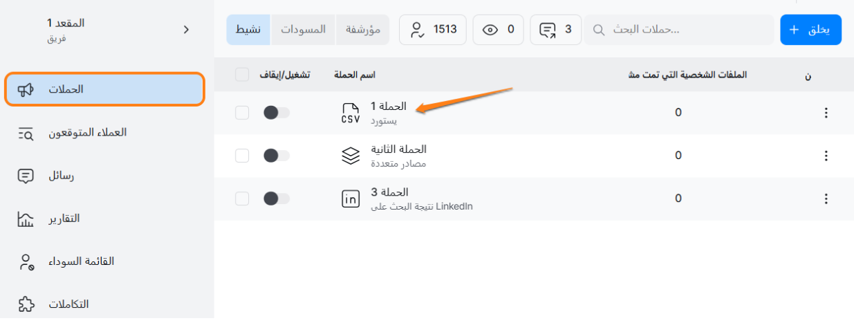 2. انقر على اسم الحملة للوصول إلى قسم قائمة العملاء المحتملين للحملة المحددة.