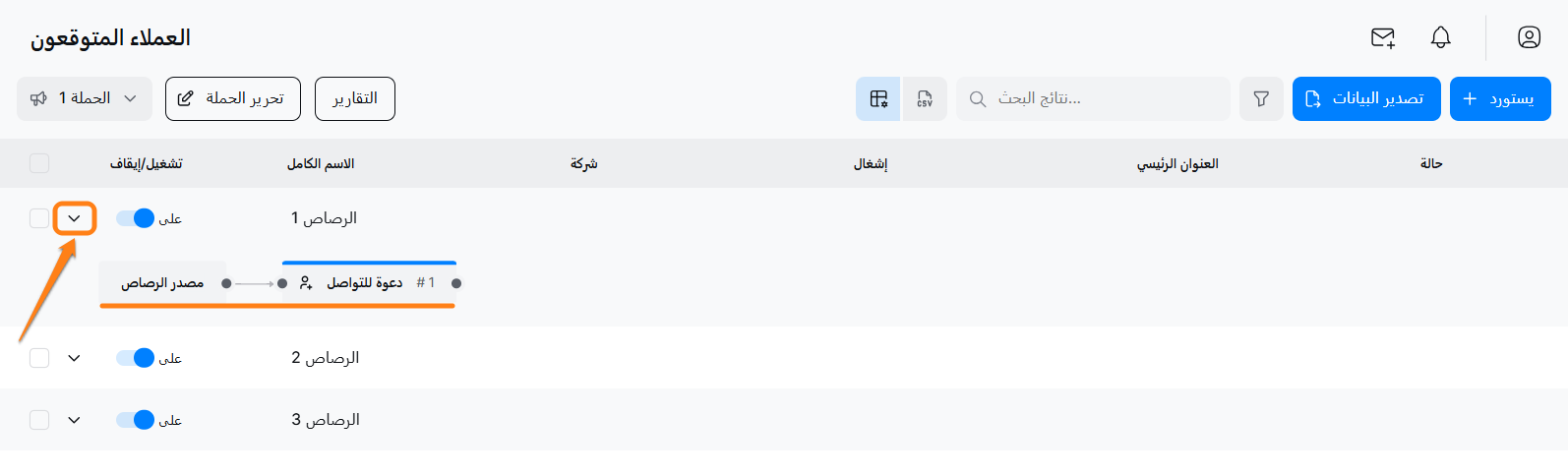 🔍 عند اتباع هذه الخطوات، ستظهر لك قائمة العملاء المحتملين للحملة المختارة التي تبدو هكذا: