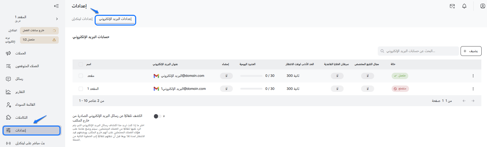 أولاً، توجه إلى علامة التبويب الإعدادات وابحث عن قسم إعدادات البريد الإلكتروني. حدد حسابات البريد الإلكتروني التي تريد تحديثها بشكل جماعي. -