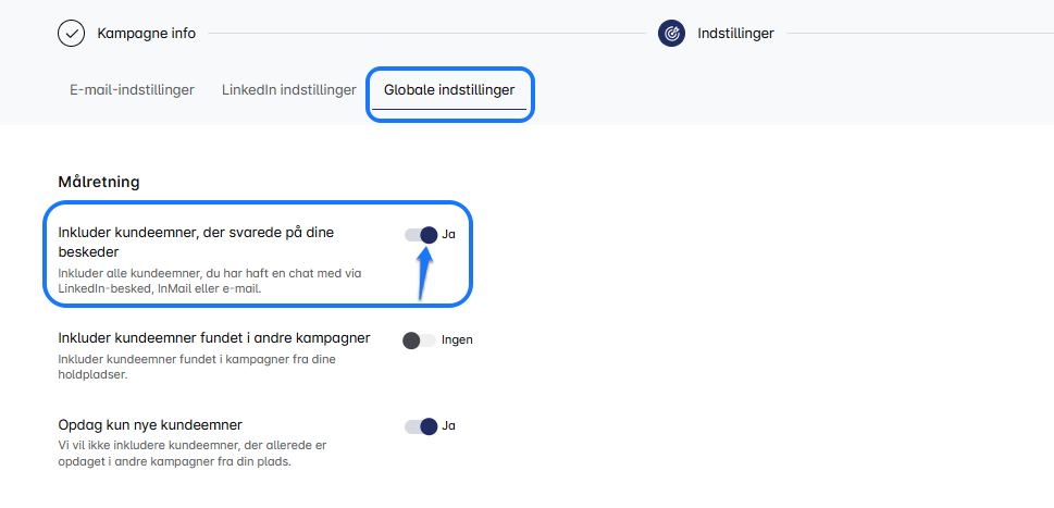 - Hvis du sender emails til leads, du tidligere har kontaktet, skal du aktivere muligheden for at fortsætte samtaletråden i Kampagneoprettelsesflow > Indstillinger trin > Globale Indstillinger.