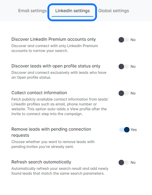 - Inkluder leads fundet i andre kampagner: Når denne er aktiveret 🔛, vil leads fra andre kampagner (dine eller dit teams) blive inkluderet, men de, der er på sortlister, vil blive fjernet.