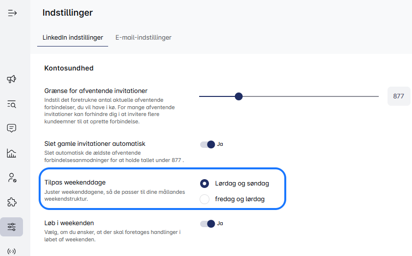 Boost dine LinkedIn-kampagner med Sales Engagement Tool Kør i weekender-funktionen! Placeret under Kontoens sundhed, holder denne mulighed kampagner aktive i weekenderne for at engagere sig med et bredere publikum. Brug det selektivt for at undgå LinkedIns automatiserede aktivitetsflag og opretholde din kontos sikkerhed.