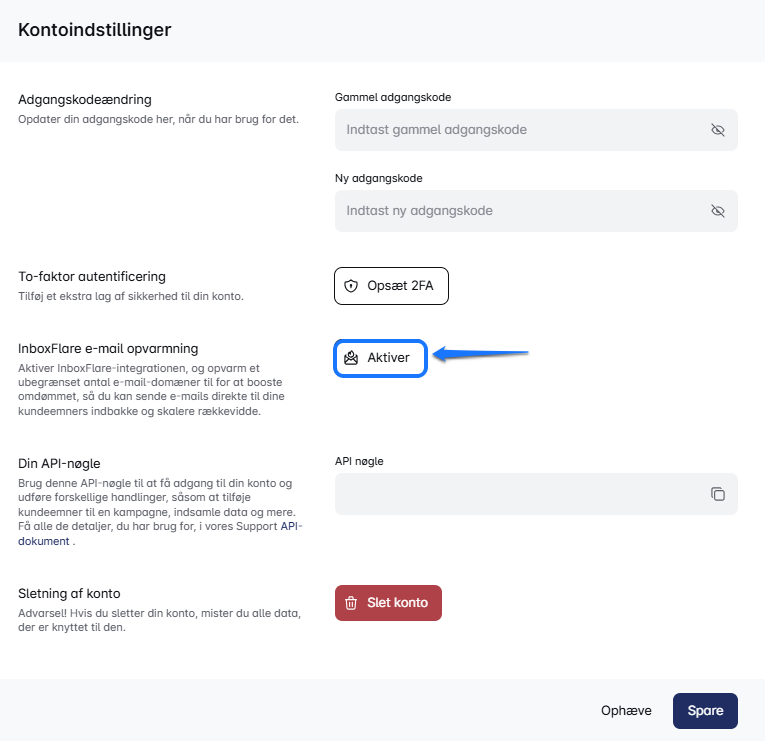 1. For at starte skal du aktivere din InboxFlare-konto i Sales Engagement Tool. Gå til dine kontoindstillinger i Sales Engagement Tool og find InboxFlare email warm-up. Klik på “Aktiver”.