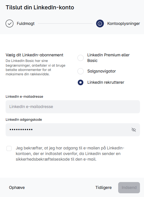 Hvis du lige er startet med Sales Engagement Tool, er det en leg! Under onboarding-processen får du mulighed for at vælge 'Recruiter' som din abonnementstype. Bare sæt kryds i den boks, og du er godt i gang! ✅