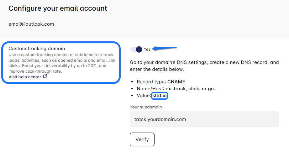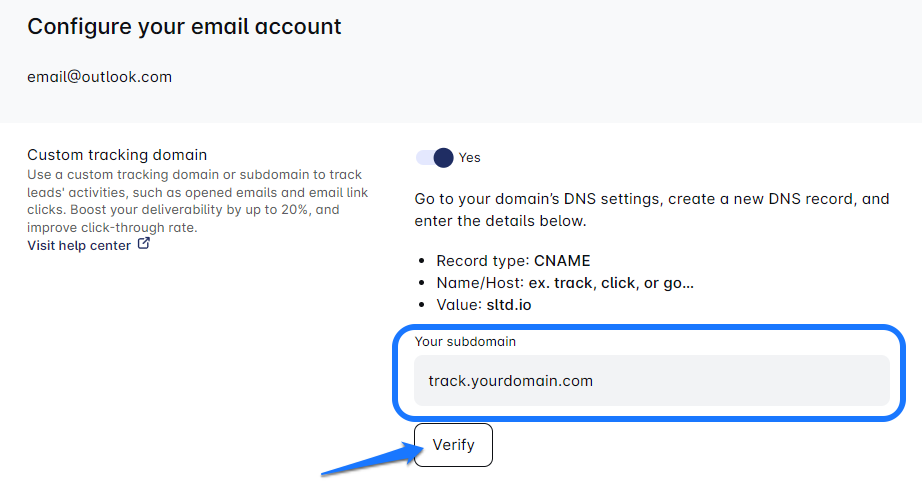 - Enter your custom tracking domain in the Sales Engagement Tool’s Your Domain field (e.g., track.yourdomain.com), then click the Verify button to verify it.