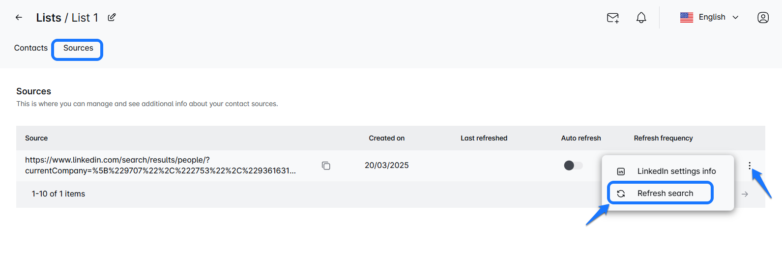 This will open a new screen displaying all the contacts in your list. To see where these leads came from, click on Sources—there you’ll find all the sources used for that specific list. 🔍Next, click on the three-dot menu next to the search you want to refresh and select Refresh search. This will revisit the original search link and automatically add any new contacts it finds to your list. 🔄
