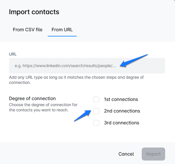 - The other import option is to insert a Search URL: Just enter the URL, and you’re all set! 🌟 You can then pick your preferred connection degree. ✨