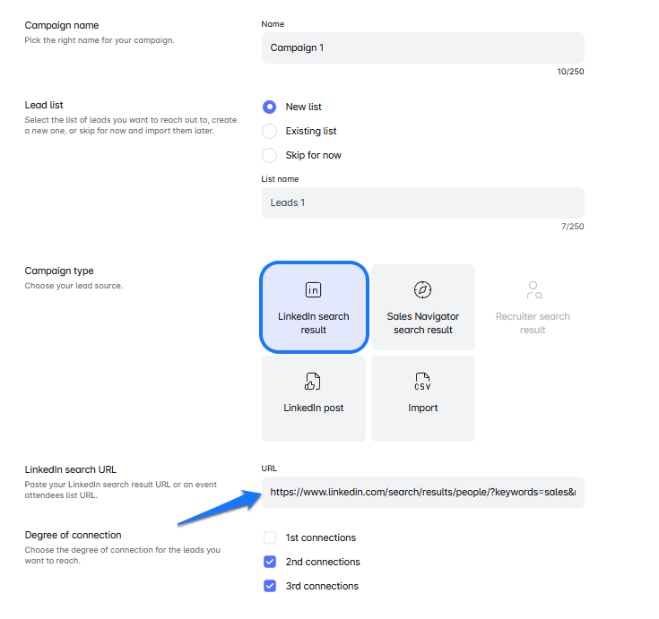 In Sales Engagement Tool, paste your LinkedIn search URL into the designated area. Give your campaign a name that resonates with your goals.