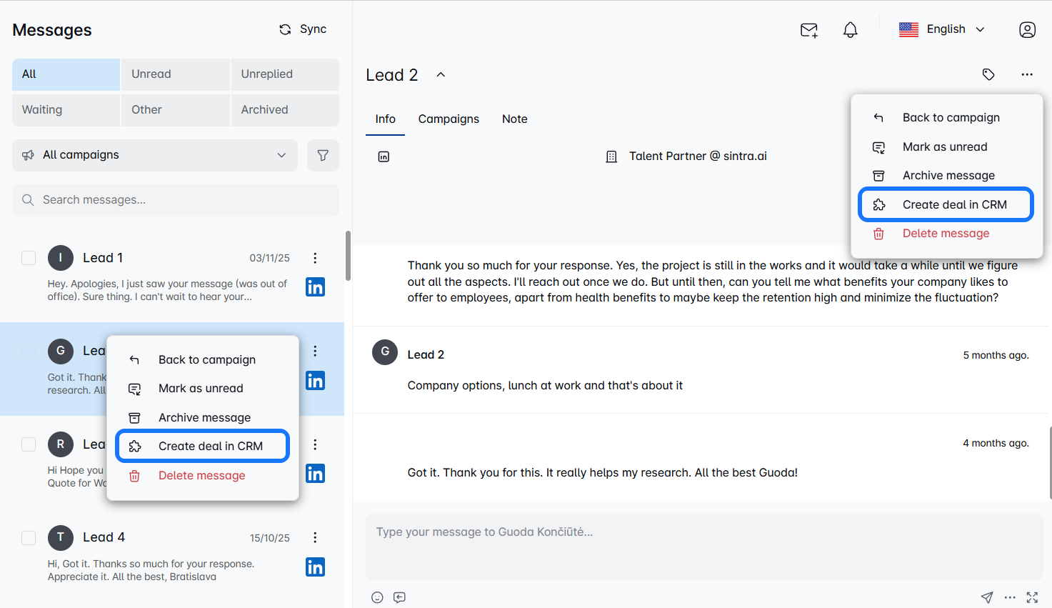 Once connected, you can start pushing leads and creating deals directly from the Messages page in Sales Engagement Tool.