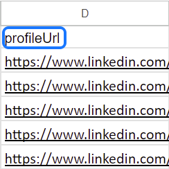 - Para una campaña combinada de email + LinkedIn, necesitarás dos columnas: una para direcciones de correo electrónico y otra para URLs de perfil de tus prospectos. Asegúrate de que la columna con URLs de perfil se llame exactamente profileUrl (con 'U' en mayúscula).