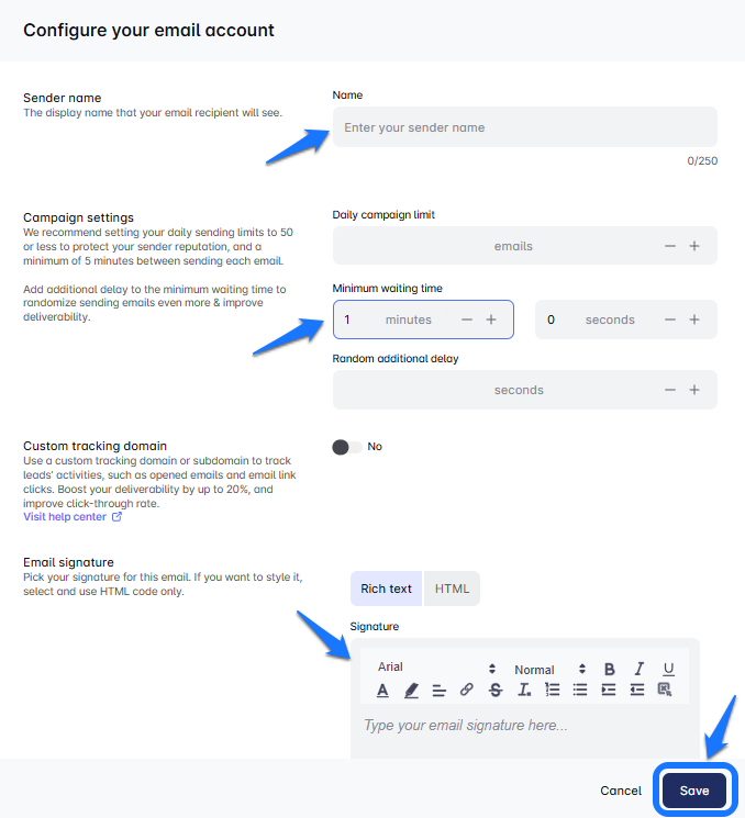 Realiza las ediciones necesarias: Nombre, Límites diarios, Dominio de seguimiento personalizado, Firma o opción de BCC y ¡voilà! 🎯 Tus actualizaciones se aplicarán a todas las cuentas de correo electrónico seleccionadas al instante.