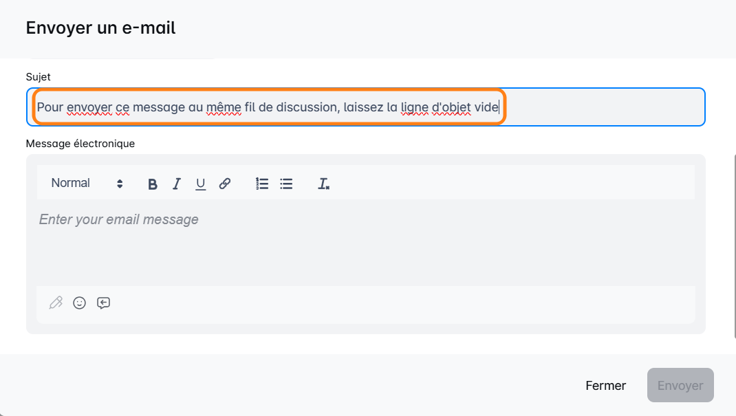 - Pour continuer un fil de discussion par e-mail après votre e-mail initial, il suffit de ne pas ajouter de ligne d'objet dans vos e-mails suivants. En laissant le champ de l'objet vide, Sales Engagement Tool envoie intelligemment ces e-mails comme faisant partie du même fil. C'est aussi simple que ça !