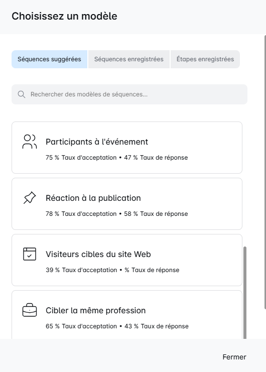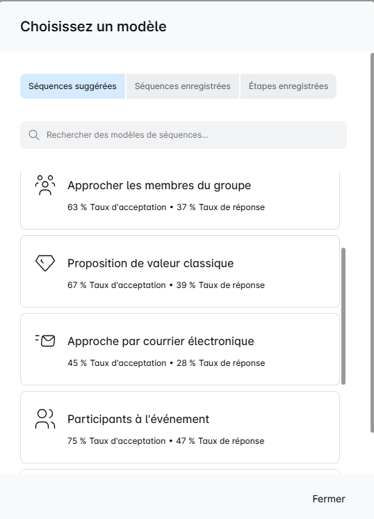 Déverrouillez la puissance des modèles de campagne dans le Sales Engagement Tool ! 🎉 Cliquez simplement sur « Modèles » dans le coin supérieur droit du créateur de campagne pour accéder à sept options préconçues pour divers objectifs de prospection. Adaptez-les à vos besoins uniques et élevez vos campagnes sans effort. Commencez à vous connecter avec facilité et efficacité ! 🚀