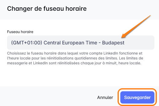 Ce simple ajustement garantit que vos actions LinkedIn et vos horaires d'e-mails sont parfaitement synchronisés, rendant vos interactions opportunes et plus efficaces pour l'exécution. Dans les options décrites dans le guide, vous pouvez choisir de faire les réglages appropriés, sélectionner le bon fuseau horaire qui convient à vos campagnes et enregistrer les modifications par la suite. Faisons en sorte que les campagnes fonctionnent comme sur des roulettes !⏰