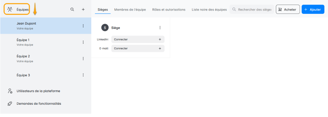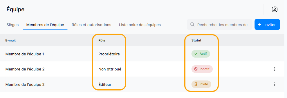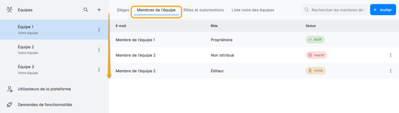 Cliquez sur l'onglet 'Membres de l'équipe' pour un aperçu de la composition actuelle de votre équipe où vous pouvez voir les rôles de chacun, inviter de nouveaux membres, et plus encore.