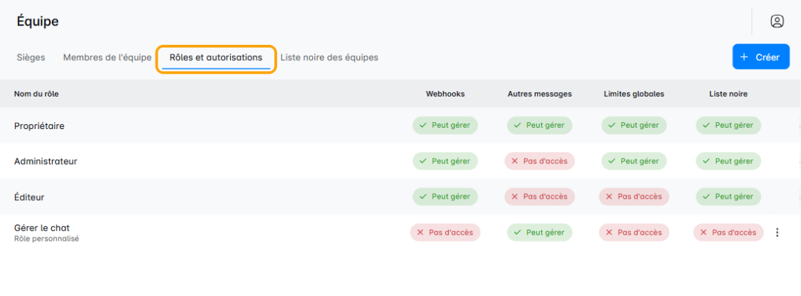 Cette section vous donne un aperçu rapide des rôles de base comme propriétaire, administrateur et éditeur, ainsi que des rôles personnalisés que vous avez créés.