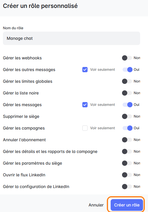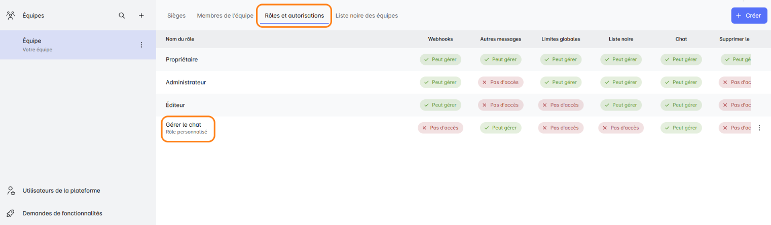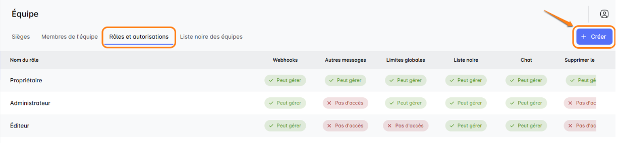 Allez dans 'Rôles & Permissions', cliquez sur 'Créer' et sélectionnez des autorisations comme la gestion des campagnes, la gestion des messages ou la mise sur liste noire. Vous pouvez même définir des rôles en mode consultation uniquement pour un accès d'observation. Avec les Rôles Personnalisés, vous pouvez vous assurer que chaque membre de l'équipe dispose des bons outils et du bon niveau d'accès, améliorant ainsi l'efficacité et l'organisation. Profitez de la flexibilité pour façonner les rôles de l'équipe selon vos spécifications exactes !✈️🌟