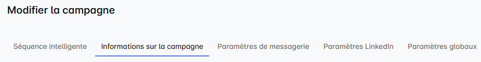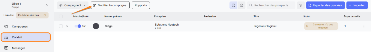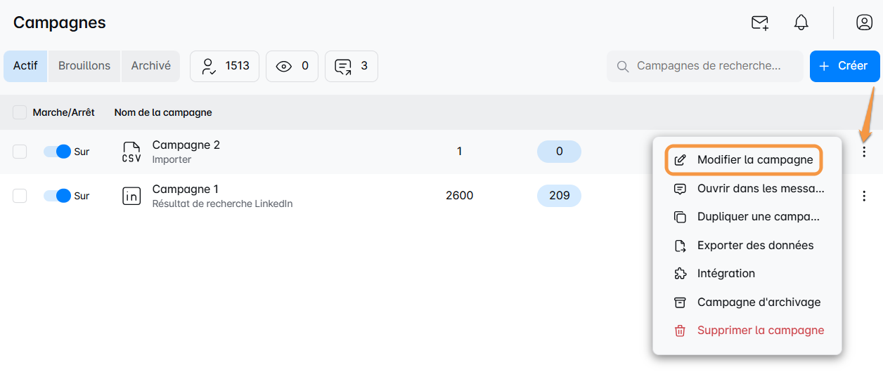 - Alternativement, vous pouvez entrer en mode édition en sélectionnant une campagne puis en choisissant l'onglet 'Modifier la campagne' depuis la page Leads.