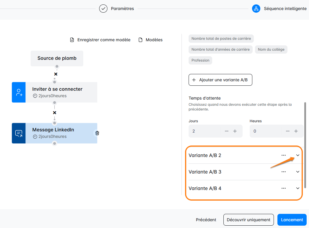 - Dans Sales Engagement Tool, vous pouvez tester différentes parties de votre message, telles que les messages LinkedIn, les emails, les InMails, les invitations à se connecter, ou même le timing entre les étapes lors du processus de création de la séquence de campagne. Vous pouvez créer jusqu'à 5 variantes de test différentes !