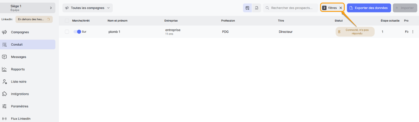 Cliquez sur l'icĂŽne d'entonnoir, et voilĂ ! Vous ĂȘtes maintenant dans la zone de filtrage des prospects. C'est lĂ que la magie opĂšre. Personnalisez les prospects que vous souhaitez voir et exporter en appliquant ces filtres :