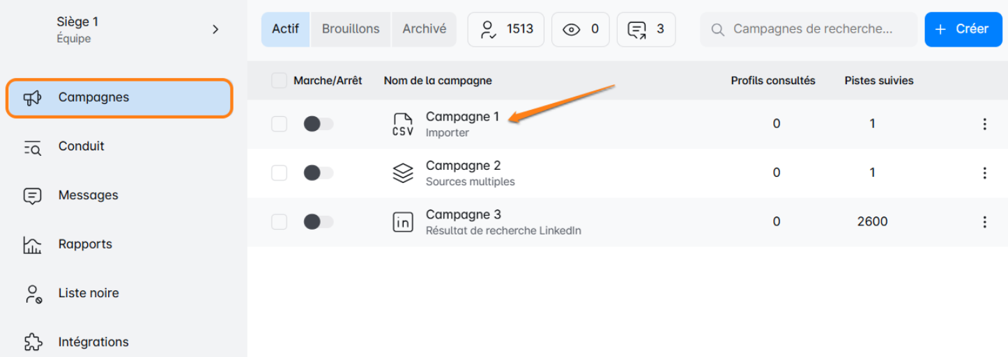2. Cliquez sur le nom de la campagne pour accéder à la section de la liste des prospects de la campagne spécifique.