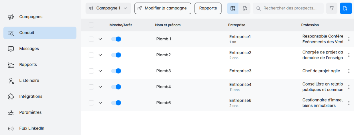 🔍 En suivant ces étapes, vous verrez une liste de prospects pour la campagne de votre choix qui ressemble à ceci :
