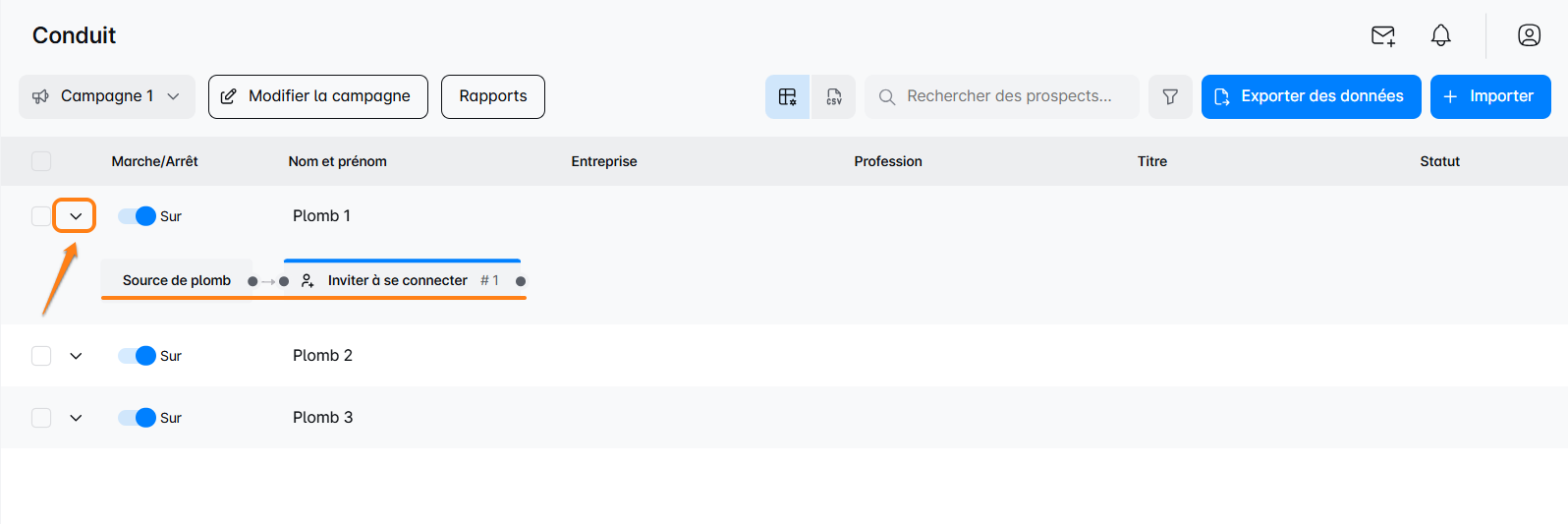 🔍 Pour explorer plus en profondeur le parcours d'un prospect, cliquez simplement sur la flèche à côté de son nom et vous pourrez voir la progression actuelle des prospects dans la campagne.