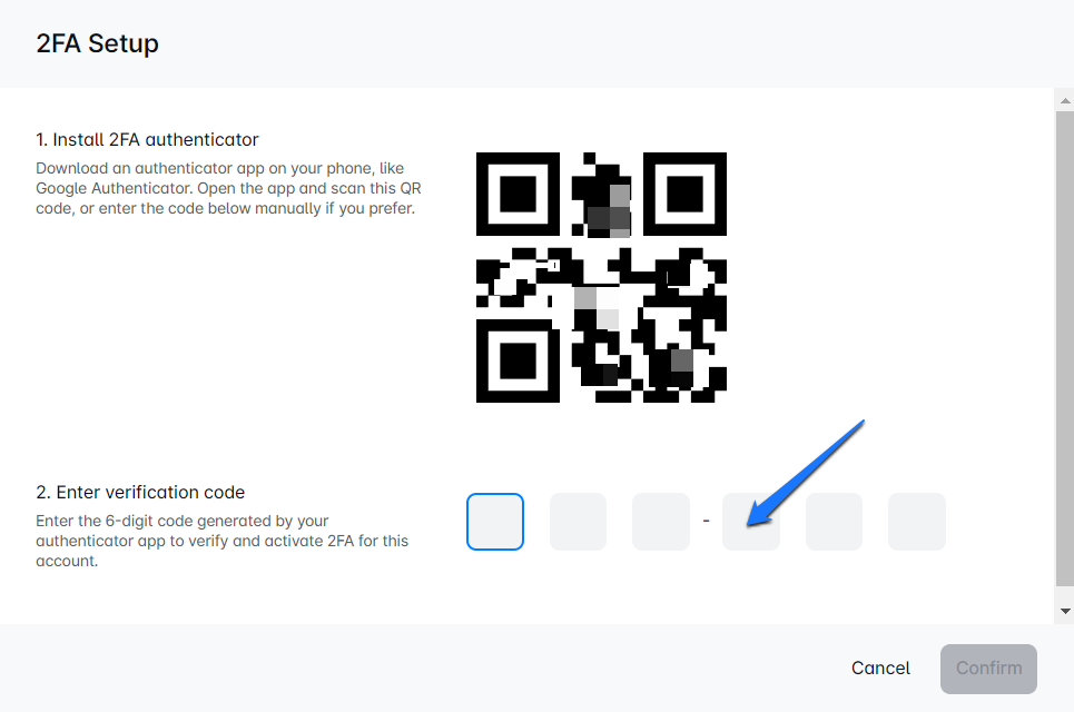 QR कोड स्कैन करें: ऑथेंटिकेटर ऐप खोलें और इसे अपने स्क्रीन पर प्रदर्शित QR कोड को स्कैन करने के लिए उपयोग करें। यदि आप कोड स्कैन नहीं कर सकते हैं, तो यहां एक कोड है जिसे आप अपने ऑथेंटिकेटर ऐप में डाल सकते हैं।