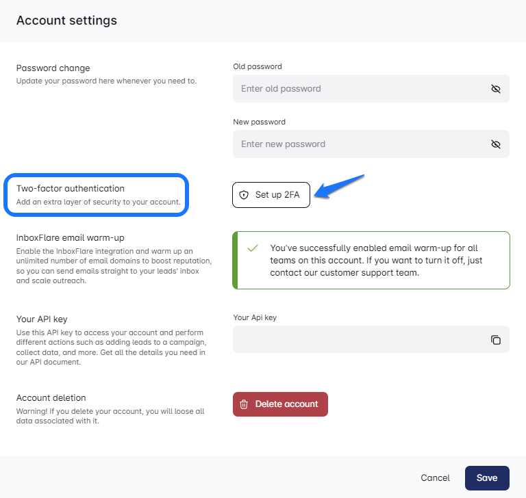 पंजीकरण और सत्यापन: अपनी Sales Engagement Tool पंजीकरण पूरी करें और अपने ईमेल पते को सत्यापित करें। एक बार हो जाने पर, एक स्क्रीन पॉप अप होगी जो आपको 2FA सक्रिय करने के लिए प्रेरित करेगी।