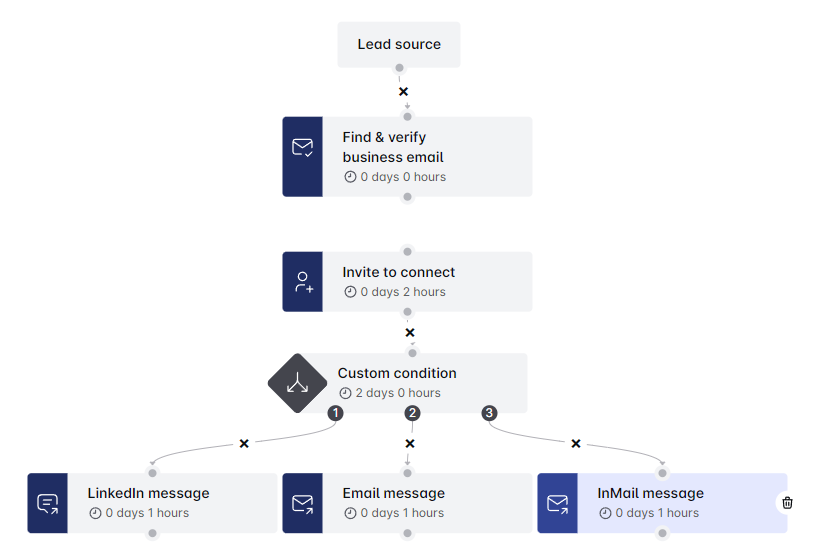 यदि कनेक्टेड नहीं ➡️ यदि सत्यापित ईमेल नहीं ➡️ यदि फ्री InMails के लिए खुला ➡️ InMail संदेश