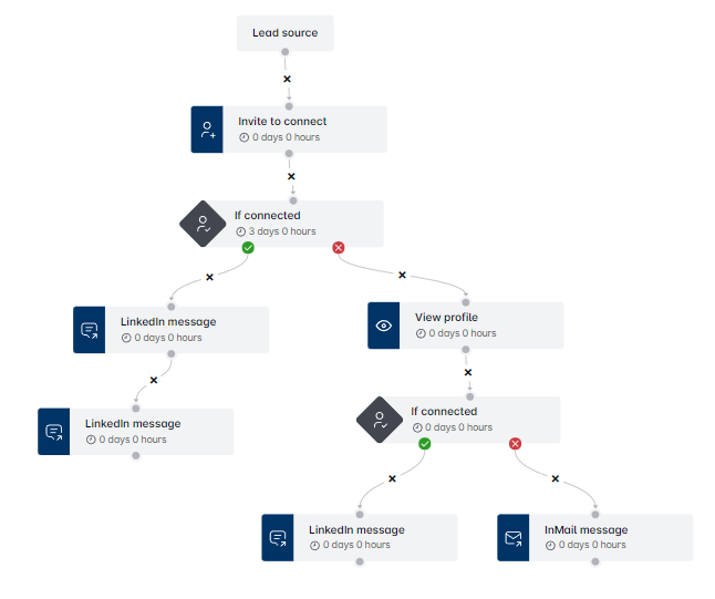 - इस प्रकार का अभियान आपको लीड्स के साथ तेजी से और अधिक तरीकों से जुड़ने की अनुमति देता है, न कि केवल 1st-डिग्री कनेक्शनों को संदेश भेजने के। प्रवाह इस प्रकार दिख सकता है:
