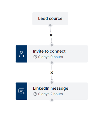 - यह सबसे आसान सेटअप है: एक प्रवाह जिसमें कनेक्ट करने के लिए आमंत्रित करें > संदेश चरण शामिल हैं। इसका मतलब है कि केवल वे लीड्स जो आपके कनेक्शन अनुरोध को स्वीकार करते हैं, संदेश चरण में जाएंगे। चाहे वे तुरंत स्वीकार करें, एक सप्ताह बाद, या यहां तक कि एक साल बाद, वे स्वीकार करने पर अनुक्रम में आगे बढ़ेंगे। आप जितने चाहें उतने संदेश फॉलो-अप जोड़ सकते हैं, उनके बीच अपनी पसंद की समय देरी के साथ।
