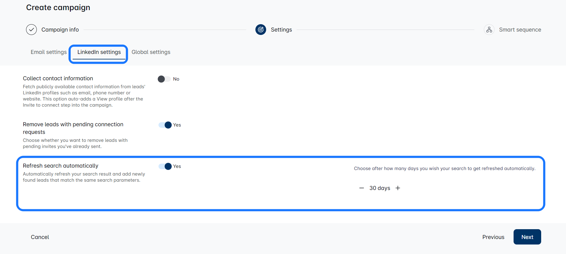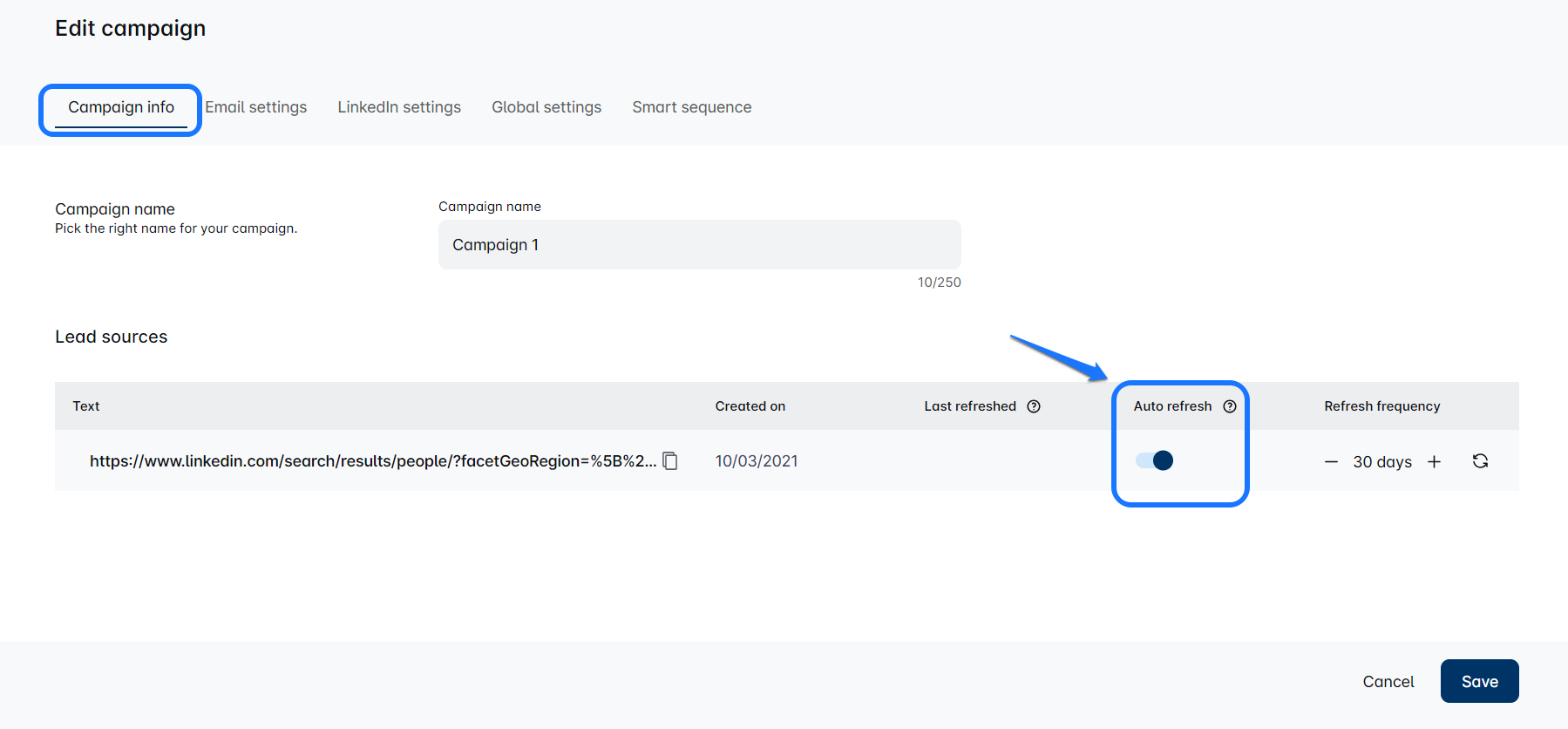 टैब 'अभियान जानकारी', पर आप यहां Refresh search को सक्षम करने का विकल्प देखेंगे: