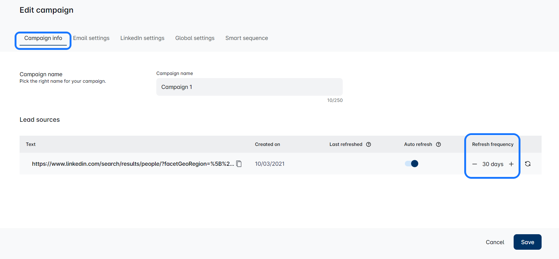 आप इस विकल्प का उपयोग करने के लिए आवृत्ति सेट कर सकते हैं कि Sales Engagement Tool कितनी बार आपकी खोज लिंक को ताज़ा करे।