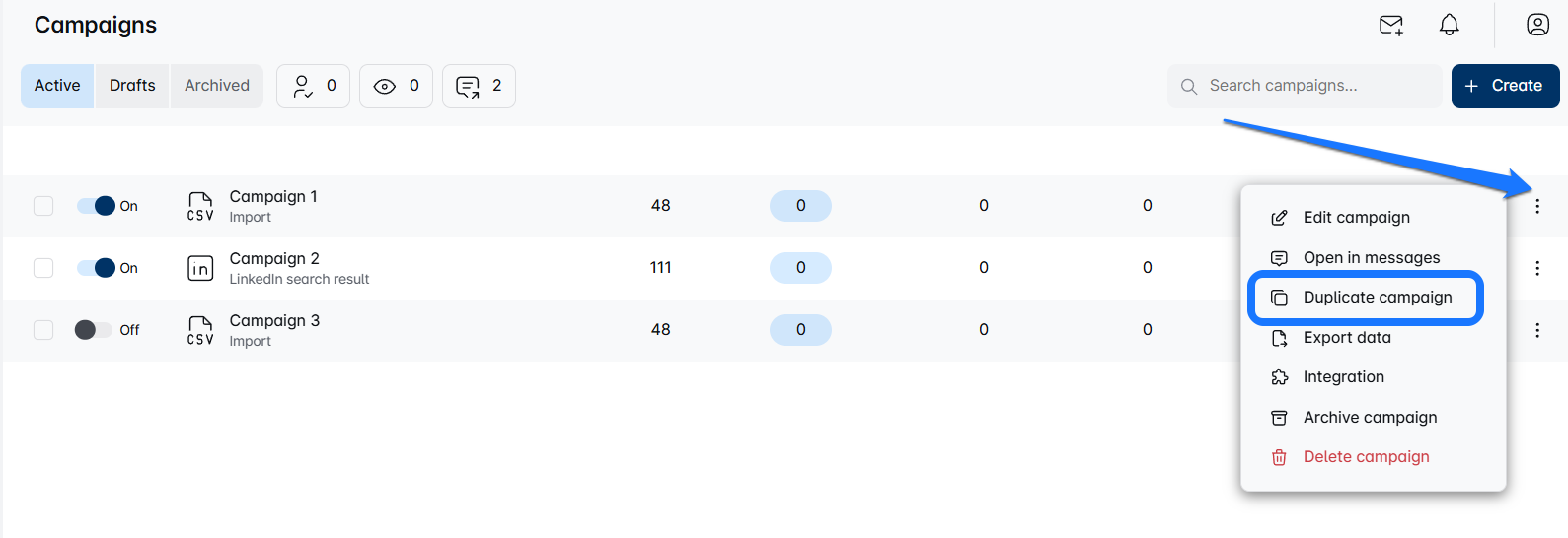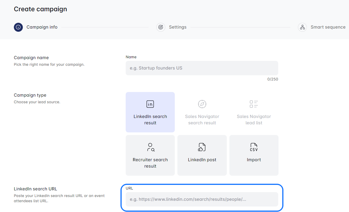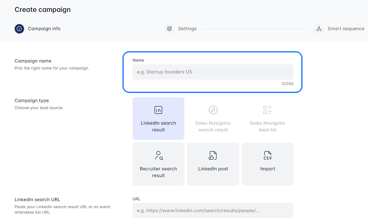 मौजूदा अभियान के चरणों का उपयोग करके एक नया अभियान शुरू करना सरल है! अपने वर्तमान अभियान को डुप्लिकेट करें, एक अनूठा नाम जोड़ें, और LinkedIn URL, CSV, या Sales Navigator Search के माध्यम से लीड्स आयात करें। यदि आवश्यक हो तो लीड सेटिंग्स को अपडेट करना सुनिश्चित करें। अभियान बनाने का आनंद लें! 🚀