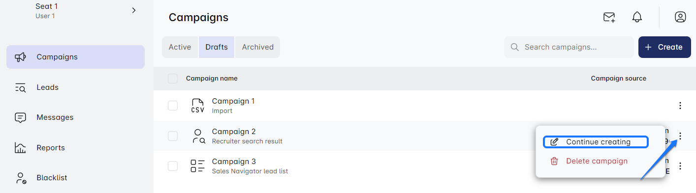 - फिर से शुरू करने के लिए तैयार हैं? बस अपने ड्राफ्ट के बगल में तीन बिंदुओं पर क्लिक करें और 'जारी रखें निर्माण' चुनें। लेकिन सावधान रहें—गलती से 'हटाएं' विकल्प पर क्लिक करने का मतलब है कि आपके अभियान को स्थायी रूप से अलविदा कहना, और इसे पुनः प्राप्त करने का कोई तरीका नहीं है। 🚫