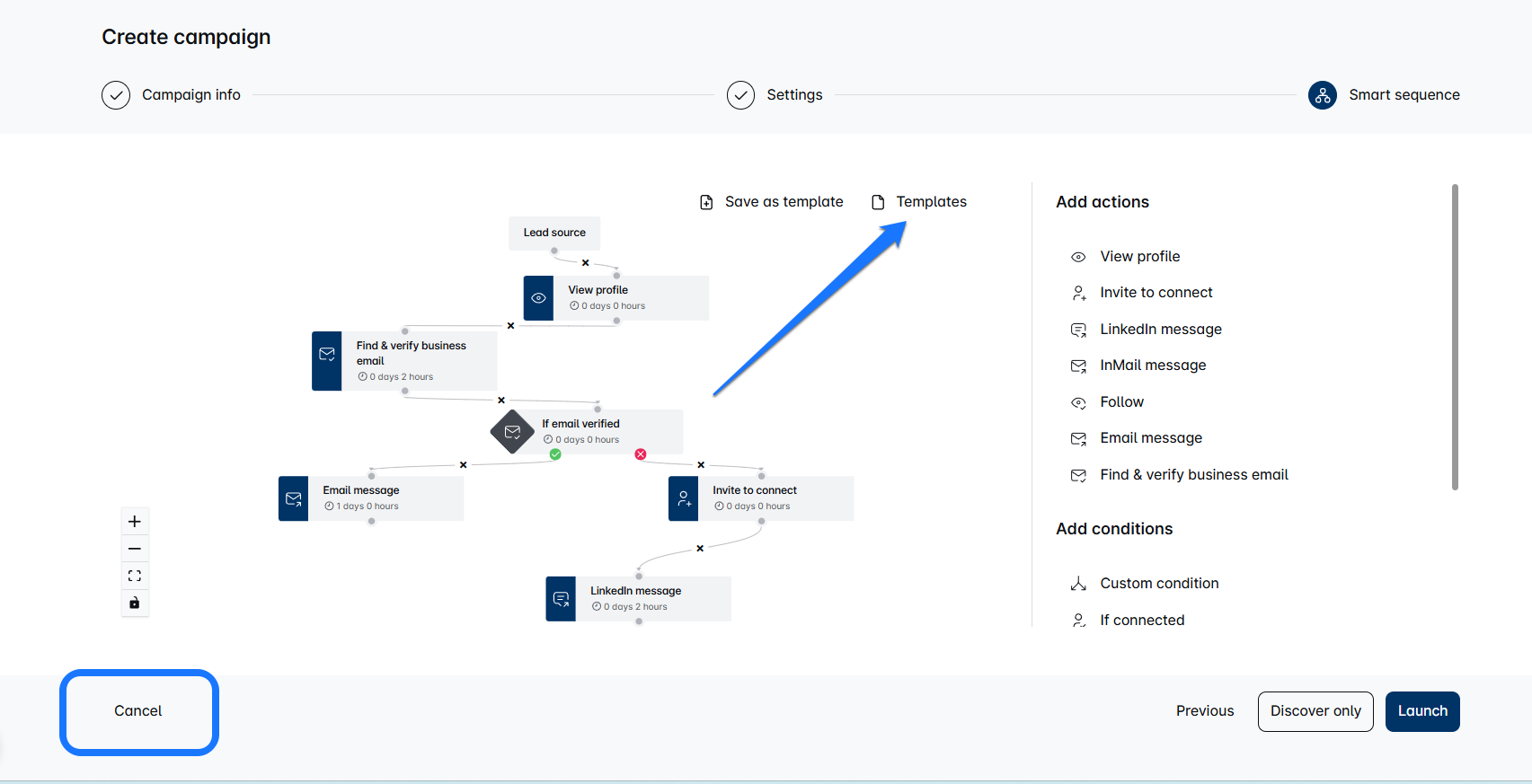 - एक बार जब आप स्मार्ट सीक्वेंस डैशबोर्ड में हों, टेम्पलेट्स बटन पर क्लिक करें और उस टेम्पलेट का चयन करें जिसे आप साझा करना चाहते हैं। प्लेटफ़ॉर्म इसे स्वचालित रूप से अभियान सेटअप के भाग के रूप में सहेज लेगा। अब, स्क्रीन से बाहर निकलने के लिए बस रद्द करें बटन दबाएं।