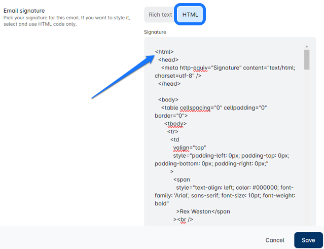 Se ti senti un po' più avventuroso, questa funzione ti permette di personalizzare la tua firma utilizzando il codice HTML. Puoi aggiungere tutti i tipi di elementi divertenti come testo, immagini, link, gif animate e icone.