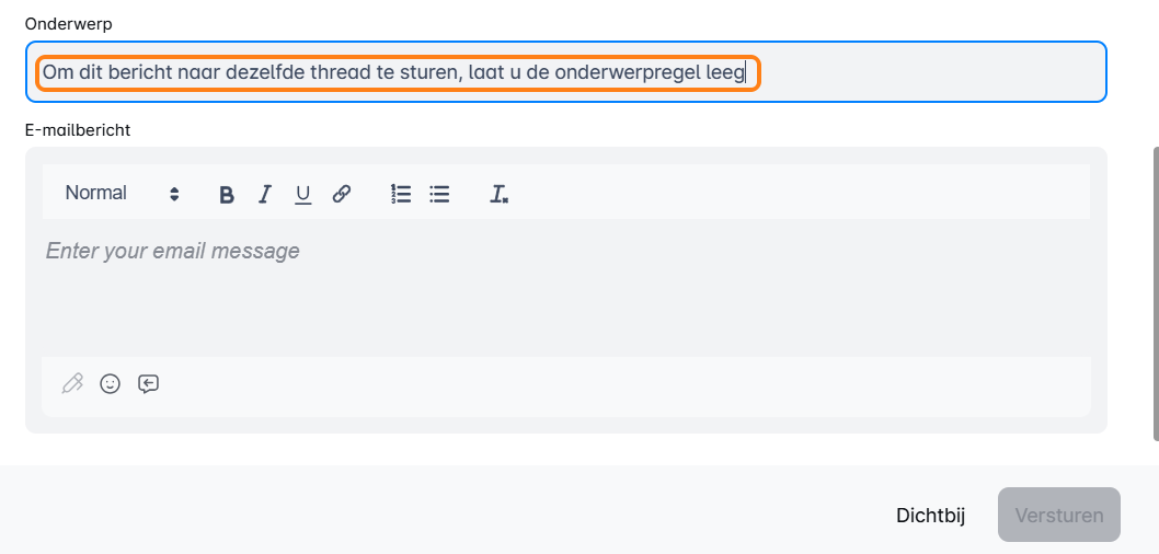 - Om een e-mailthread voort te zetten na je eerste e-mail, hoef je alleen maar geen onderwerpregel toe te voegen in je volgende e-mails. Door het onderwerpveld leeg te laten, stuurt Sales Engagement Tool deze e-mails slim als onderdeel van dezelfde thread. Zo eenvoudig is het!