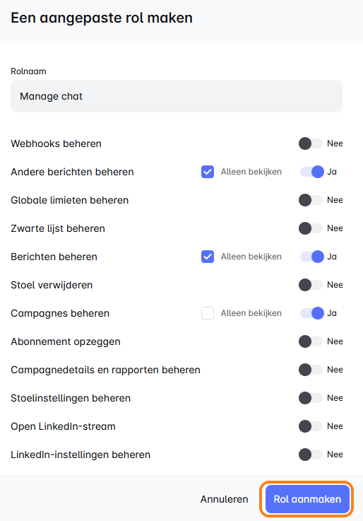 Ga naar 'Rollen & Permissies,' klik op 'Aanmaken,' en selecteer permissies zoals campagnebeheer, berichtverwerking of blacklisting. Je kunt zelfs rollen instellen voor alleen-lezen toegang voor observatie. Met Aangepaste Rollen kun je ervoor zorgen dat elk teamlid de juiste tools en toegangsniveaus heeft, wat de efficiëntie en organisatie verbetert. Geniet van de flexibiliteit om teamrollen naar jouw exacte specificaties vorm te geven!✈️🌟