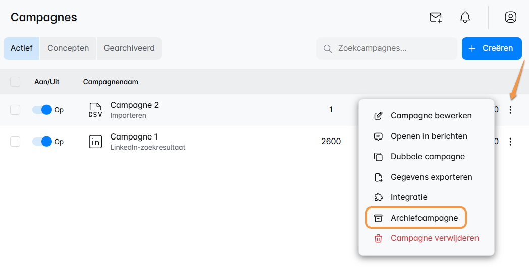 Kies in het menu dat verschijnt de optie "Campagne archiveren".