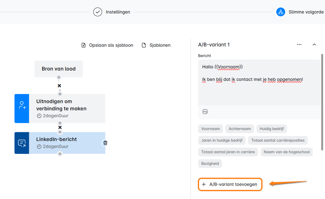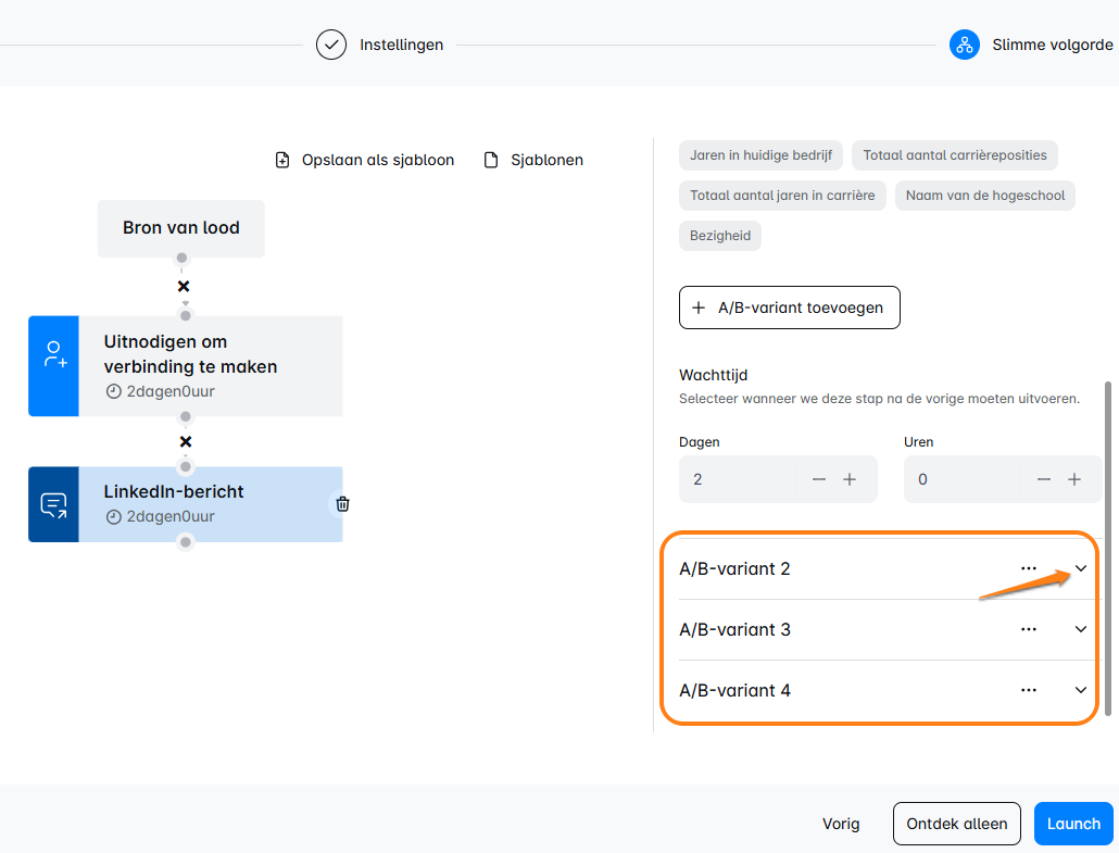 - In de Sales Engagement Tool kun je verschillende delen van je berichttekst testen, zoals LinkedIn-berichten, e-mails, InMails, uitnodigingen om te verbinden, of zelfs de timing tussen de stappen tijdens het maken van de campagnevolgorde. Je kunt tot 5 verschillende testvarianten maken!